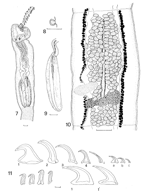 Figures 7–11. Proemotobothrium southwelli n. sp. 7. Scolex. 8. Fossette. 9. Tentacular bulb. 10. Pre-mature segment. 11. Profiles of tentacular hooks. Scale-bars: 7-10, 0.1mm; 11, 0.01 mm.