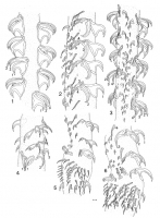 Figures 1–6. Tentacular armature of Proemotobothrium southwelli n. sp. 1. Metabasal armature, internal surface. 2. Metabasal armature, antibothridial surface. 3. Metabasal armature, external surface. 4. Basal armature, internal surface. 5. Basal armature, antibothridial surface. 6. Basal armature, oblique view of external surface. Scale-bar: 0.01mm.
