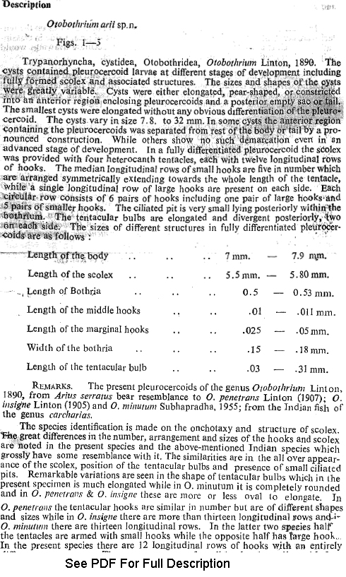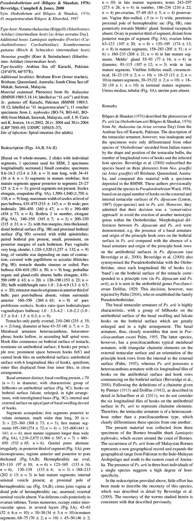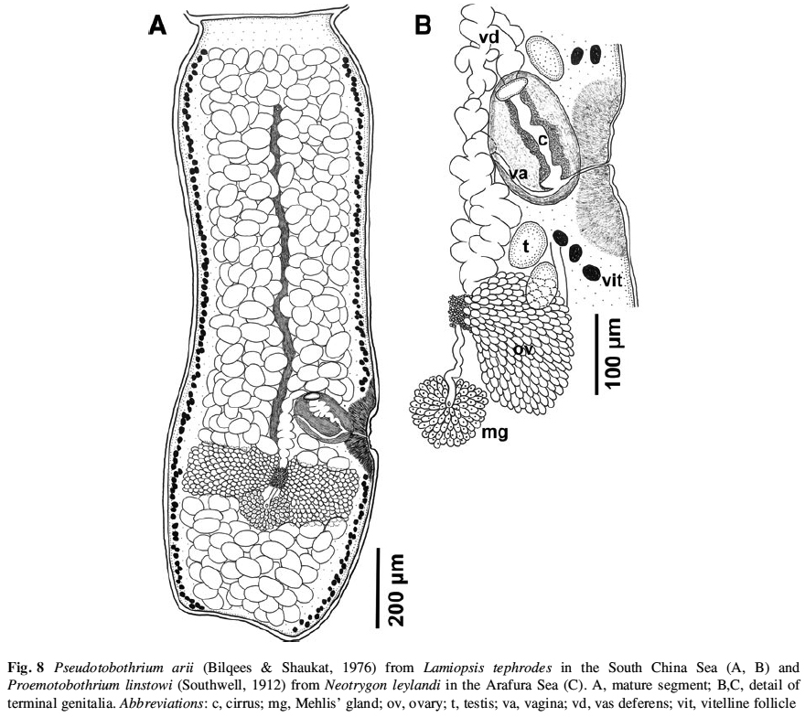 Bilqees, F.M. and N. Shaukat. 1976. Otobothrium arii sp. n. in the fish Arius serratus (Day) from Karachi coast. Agriculture Pakistan 27: 119-124. (4316) Download PDFBeveridge, I., R. A. Campbell, and M. K. Jones. 2000. New records of the cestode genus Pseudotobothrium (Trypnaorhyncha: Otobothriidae) from Australian fishes. Transactions of the Royal Society of South Australia 124(2): 151-162. (4317) Download PDF |