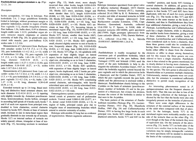 Figs 18, 19, 1.0mm; Figs 20, 21, 0.1 mm. 28. Patellobothrium quinquecatenatum n. g., n. sp. |