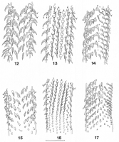 Figs. 12-17. Patellobothrium quinquecatenatum n. g., n. sp. Tentacular armature. 12. Internal surface, metabasal region, 0.84 from base. 13. External surface, metabasal region, 0.70 from base. 14. Bot... MoreFigs. 12-17. Patellobothrium quinquecatenatum n. g., n. sp. Tentacular armature. 12. Internal surface, metabasal region, 0.84 from base. 13. External surface, metabasal region, 0.70 from base. 14. Bothridial surface, metabasal region, 0.46 from base. 15. Internal surface, basal region. 16. External surface, basal region. 17. Bothridial surface, basal region. Scale-line: 0.01 mm. Figures 12-14, 16 & 17 holotype; Fig. 15 from paratype. Circles indicate the absence of hook 6. |