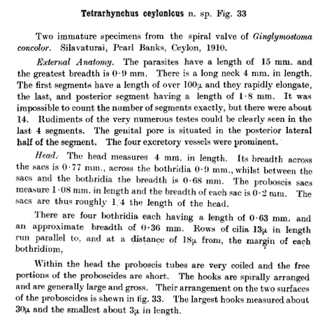 Southwell, T. 1929. A monograph on cestodes of the order Trypanorhyncha from Ceylon and India. Part I. Ceylon Journal of Science. Section B. Zoology and Geology 15: 169-312.