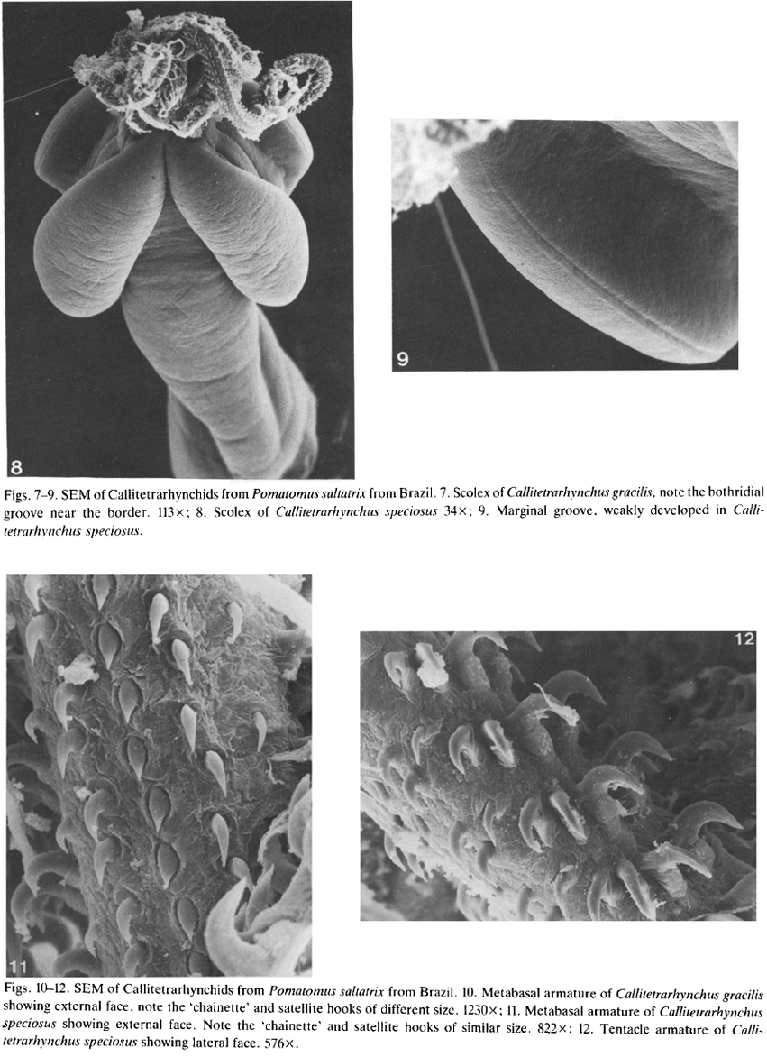 speciosus; Figs. 10-12. SEM of Callitetrarhynchids from Pomatomus saltatrix from Brazil. 10. Metabasal armature of Calfitetrarhynchus gracilis