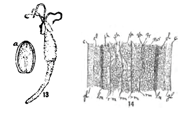 Plate IV. Rhynchobothrium speciosum, new species. 13. Embryo removed from cyst, peritoneium of Pomatomus saltatrix. Enlarged three times. a, bothrium. Enlarged six times. 14. Optical section of neck of living specimen from P. saltatrix. Enlarged eighteen times. c, cuticle; gl., granulo-fibrous layer; vl., vascular layer; lm., longitudinal muscles; Pm., parenchyma; sh., proboscis sheath; rm., retractor muscles of proboscides; Pr., retracted proboscis.
