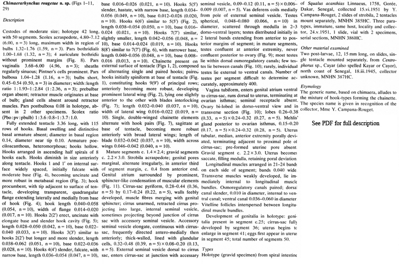 DOC, dorsal osmoregulatory canal; ESV, external seminal vesicle; LM, longitudinal muscle bundle; O, ovary; T, testis; TM, transverse musculature; V, vitelline follicles; VOC, ventral osmoregulatory canal. 29. Chimaerarhynchus rougetae n. g., n. sp. 30. Lacistorhynchus dollfusi Beveridge & Sakanari, 1987. |