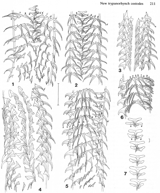 chainette. 2. External surface, metabasal region, 2.2 mm from base of te... MoreFigs 1-7. Chimaerarhynchus rougetae n. g., n. sp. Tentacular armature. 1. External surface, basal region, showing beginning of