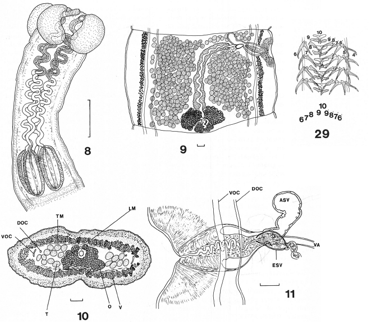 Cirrus-sac and seminal vesicles. Scale-lines: Fig. 8, 1.0mm; Figs 9-11, ... MoreFigs 8-11. Chimaerarhynchus rougetae n. g., n. sp. 8. Scolex. 9. Mature segment. 10. Transverse section of mature segment. 11.