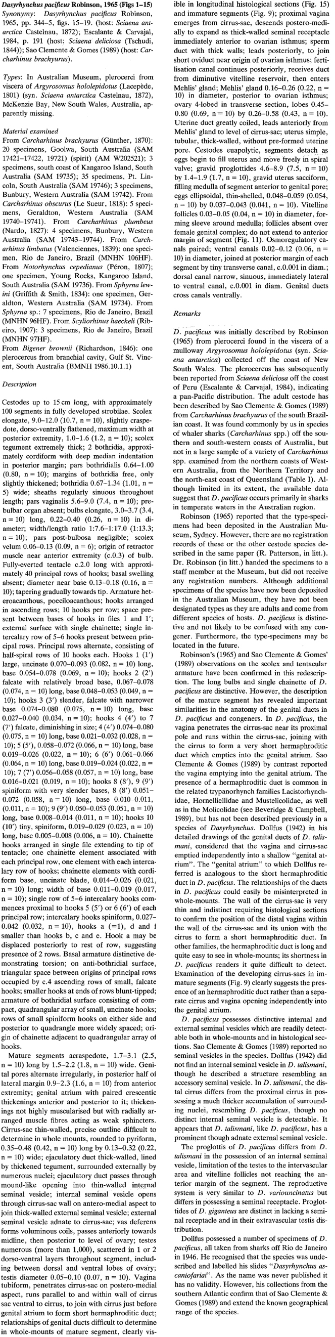 Beveridge, I. and R. A. Campbell. 1993. A revision of Dasyrhynchus Pintner (Cestoda: Trypanorhyncha), parasitic in elasmobranch and teleost fishes. Systematic Parasitology 24: 129-157. (4322) Download PDF |
