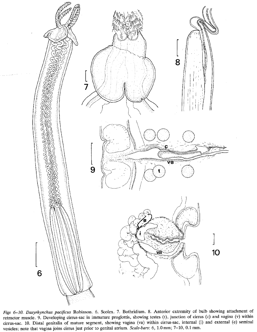 Figs 6-10. Dasyrhynchus pacificus Robinson. 6. Scolex. 7. Bothridium. 8. Anterior extremity of bulb showing attachment of
