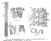 Figs. 15-19-Dasyrhynchus pacificus n. sp.: 15, scolex. 16, distal proboscid armature. 17, metabasal armature. 18, basal armature. 19, entire larva.