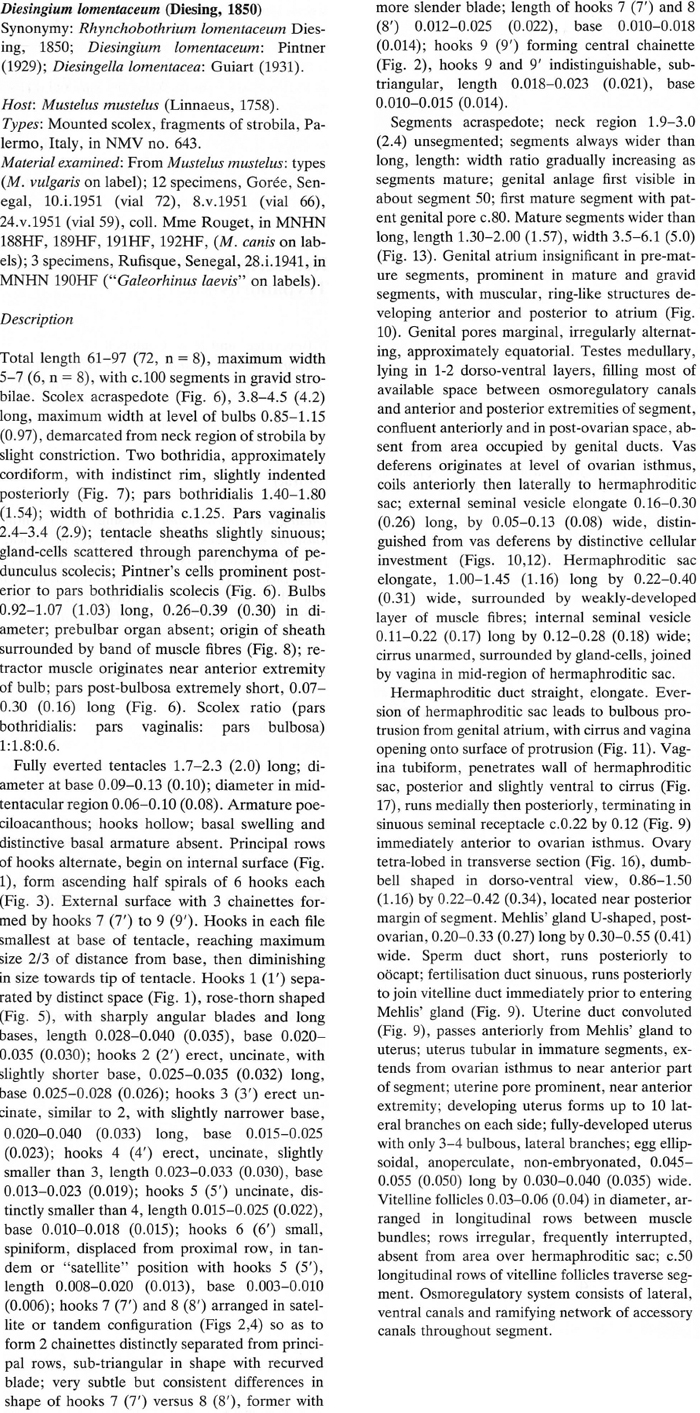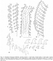 Figs 1-5. Diesingium lomentaceum (Diesing), tentacular armature: 1, basal region, internal surface; 2, basal region, external surface; 3, basal region, bothridial surface; 4, hook configuration in a s... MoreFigs 1-5. Diesingium lomentaceum (Diesing), tentacular armature: 1, basal region, internal surface; 2, basal region, external surface; 3, basal region, bothridial surface; 4, hook configuration in a single row plus central chainette (hooks 9,9'); 5, profie of hooks 1-6, 7 and 8 constituting outer chainettes (c) and 9, constituting central chainette (c). Scale-bars: 1-3, 0.10 mm; 4,5 to same scale, -0.01 m. |