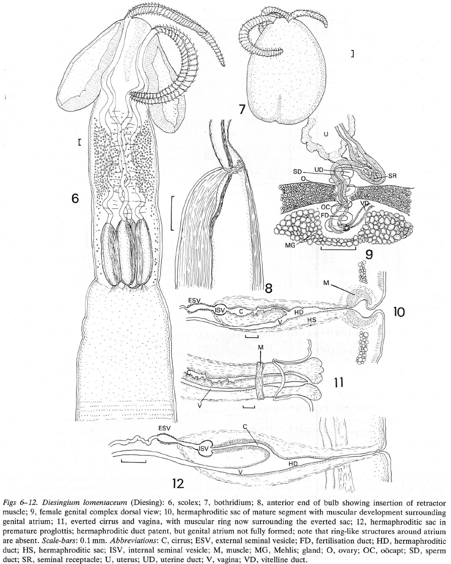 Figs 6-12. Diesingium lomentaceum (Diesing): 6, scolex; 7, bothridium; 8, anterior end of bulb showing insertion of retractor muscle; 9, female genital complex dorsal view; 10, hermaphroditic sac of m... MoreFigs 6-12. Diesingium lomentaceum (Diesing): 6, scolex; 7, bothridium; 8, anterior end of bulb showing insertion of retractor muscle; 9, female genital complex dorsal view; 10, hermaphroditic sac of mature segment with muscular development surrounding genital atrium; 11, everted cirrus and vagina, with muscular ring now surrounding the everted sac; 12, hermaphroditic sac in premature proglottis; hermaphroditic duct patent, but genital atrium not fully formed; note that ring-like structures around atrium are absent. Scale-bars: 0.1 mm. Abbreviations: C, cirrus; ESV, external seminal vesicle; FD, fertilisation duct; HD, hermaphroditic duct;' HS, hermaphroditic sac; ISV, internal seminal vesicle; M, muscle; MG, Mehlis; gland; 0, ovary; OC, oi:icapt; SD, sperm duct; SR, seminal receptacle; U, uterus; UD, uterine duct; V, vagina; VD, vitelline duct. |