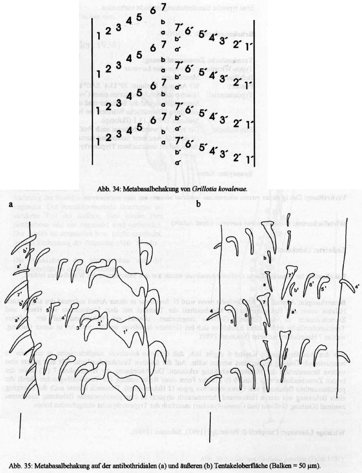 Abb. 34: Metabasalbehakung von Grillot ia kovalevae. Abb. 35: Metabasalbehakung auf der antibothridialen (a) und au6eren (b) Tentakeloberflache (Balken = 50 μm).