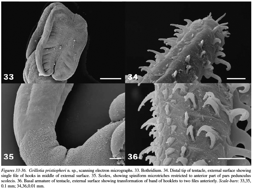single file of hooks in middle of external surface. 3... MoreFigures 33-36. Grillotia pristiophori n. sp., scanning electron micrographs. 33. Bothridium. 34. Distal tip of tentacle, external surface showing