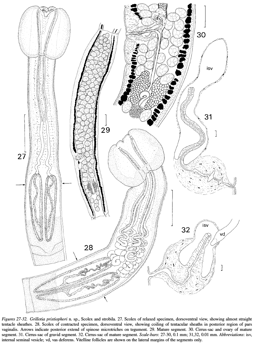 tentacle sheathes. 28. Scolex of contracted specimen, dor... MoreFigures 27-32. Grillotia pristiophori n. sp., Scolex and strobila. 27. Scolex of relaxed specimen, dorsoventral view, showing almost straight