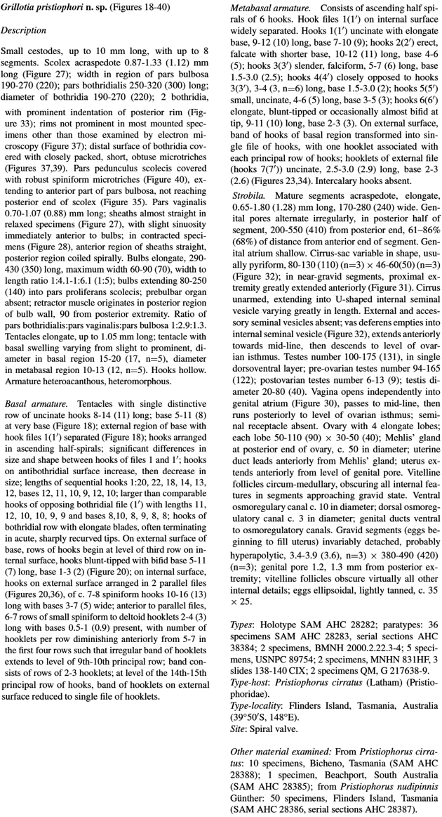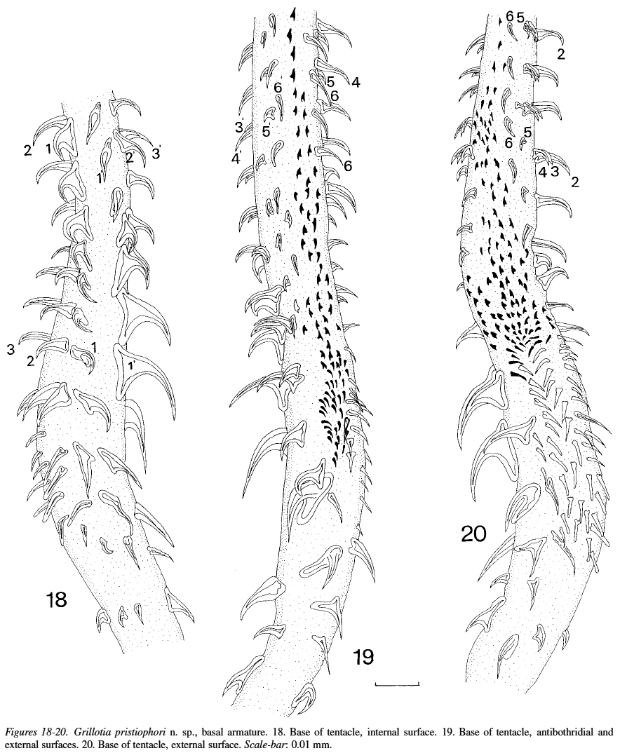external surfaces. 20. Base of tentacle, external surfac... MoreFigures 18-20. Grillotia pristiophori n. sp., basal armature. 18. Base of tentacle, internal surface. 19. Base of tentacle, antibothridial and