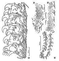 FIG. 50. - Grillotia pseuderinaceus n. sp., de Myliobatis aquila (L. 1758). Armement métabasal vu par une face, le còté interne est à gauche. FIG. 51. - Milieu du còté externe d‘un proboscis du mème spécimen, montrant les petits crochets de la base. FIG. 52. - Milieu du còté externe d‘un autre proboscis du mème spécimen, partie métabasale. FIG. 53. - Proboscis vu du còté interne avec la partie basale. Latéralement 2 grands crochets de la face bothridiale à gauche de son bord interne.