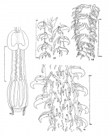FIG. 16 Grillotia (Paragrillotia) simmonsi n.sp. - Scolex. FIG. 17 G. (Pa.) simmonsi n.sp. - Armement métabasal d‘un proboscis. Côté interne. FIG. 18 G. (Pa.) simmonsi n.sp. - Armement métabasal d‘un proboscis, vu par une face; le côté interne est à droite. FIG. 19 G. (Pa.) simmonsi n.sp. - Armement métabasal d‘un proboscis. Côté externe.