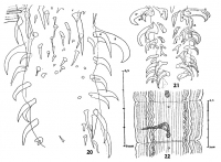FIG. 20 G. (Pa.) simmonsi n.sp. - Armement basal d‘un proboscis. Côté externe. FIG. 21 G. (Pa.) simmonsi n.sp. - Armement basal d‘un proboscis. Côté interne. FIG. 22 G. (Pa.) simmonsi n.sp. - Proglottis immature.