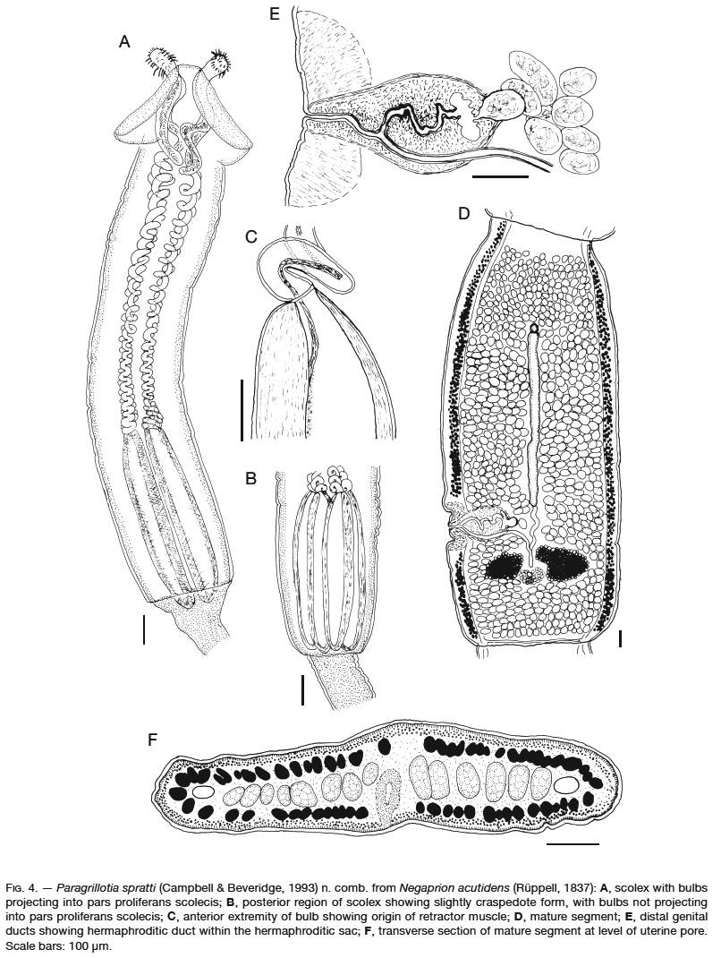 Beveridge, I. and J.-L. Justine. 2007. Paragrillotia apecteta n. sp. and redescription of P. spratti (Campbell & Beveridge, 1993) n. comb. (Cestoda: Trypanorhyncha) from hexanchid and carcharhinid sharks off New Caledonia. Zoosystema 29: 381-391.
