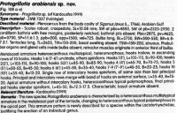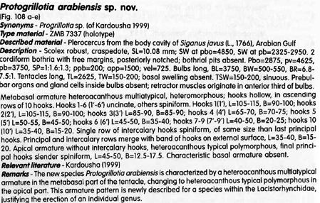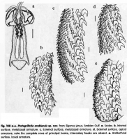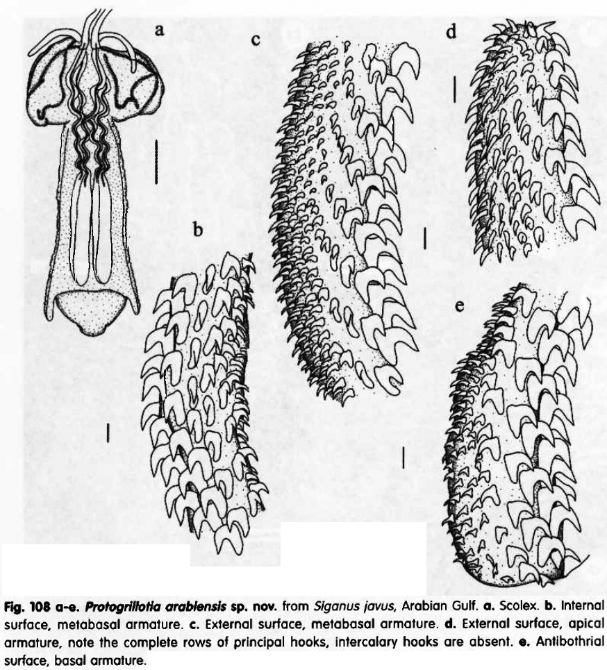 Fig. 108 a-e. Profogrillotia arabiensis sp. nov. from Siganus javus, Arabian Gulf. a. Scolex. b. Internal surface, metabasal armature, c. External surface, metabosol armature, d. External surface, apical armature, note the complete rows of principal tiooks, intercalary hooks are absent, e. Antlbothrial surface, basal armature.