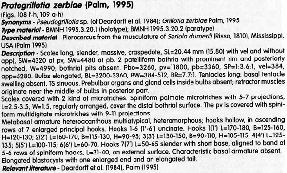 Synonyms Pseudogrillotia zerbiae Palm, 1995 Grillotia zerbiae Palm, 1995 (Palm, 2004) - lapsus calami
