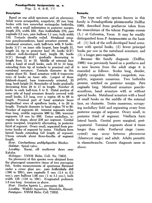 | Additional Host(s) | Plerocerci from Diodon hystrix (Carvajal et al, [1976]) | ||||||