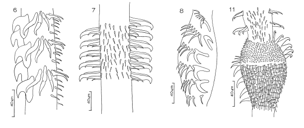 FIGURES 6-14. Tentacle armatures of Hawaiian trypanorhynchs. Pseudogrillotia basipunctata. 6. Metabasal, bothridial face. 7. Metabasal, external face. 8. Basal, internal face. 11. Basal, internal face.