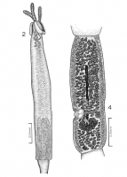 FIGURES 2, 4. Hawaiian trypanorhynchs. 2, 4. Scolex and mature segment of Pseudogrillotia basipunctata (holotype).
