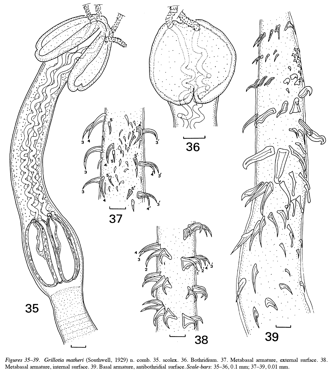 Figures 35–39. Grillotia matheri (Southwell, 1929) n. comb. 35. scolex. 36. Bothridium. 37. Metabasal armature, external surface. 38. Metabasal armature, internal surface. 39. Basal armature, antibothridial surface. Scalebars: 35–36, 0.1 mm; 37–39, 0.01 mm.