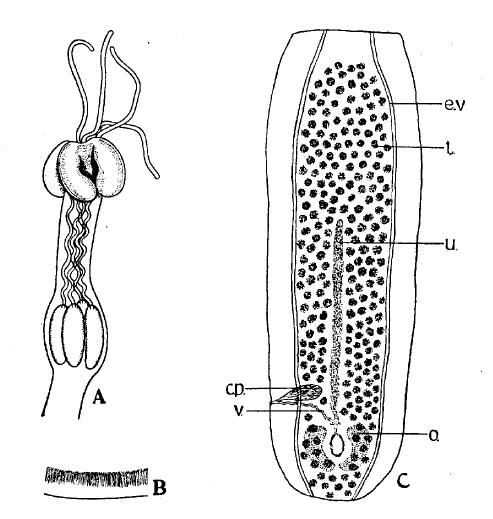 Fig. 34. - Tetrarhynchus matheri n. sp. A - head and neck x 46. B - margin of bothridium showing cilia x 400. C - mature segment x 96 (Orig.).