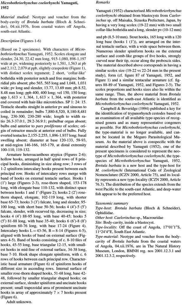 | Host Notes | Yamaguti originally described this species from "Coelorhynchus sp. (=Coelorinchus sp.). Type host listed here is the host from which Palm (2002)'s neotype was recovered. |
