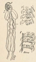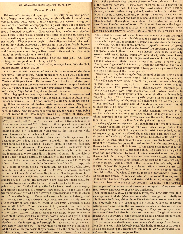 In Linton 1890. Plate XII. Figs. 7-9. Rhynchobothrium imparispine sp. nov. Fig. 7. Head and neck, from alcoholic specimen, x15. Fig. 8. Proboscis near middle, x about 200. Fig. 9. Proboscis near apex, x about 200.