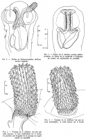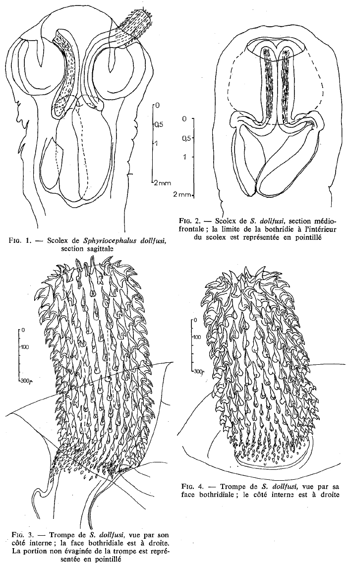 FIG. 1. - Scolex de Sphyriocephalus dollfusi, section sagittale. FIG. 2. - Scolex de S. dollfusi, section mediofrontale; la limite de la bothridie a l'interieur du scolex ·est representee en pointille. FIG. 3. - Trompe de S. do/lfusi, vue par son cote interne ; la face bothridiale est a droite. La portion non evaginee de la trompe est representee en pointille. FIG. 4. - Trompe d,e S. dollfusi, vue par sa face bothridiale ; le cote intern; est a droite