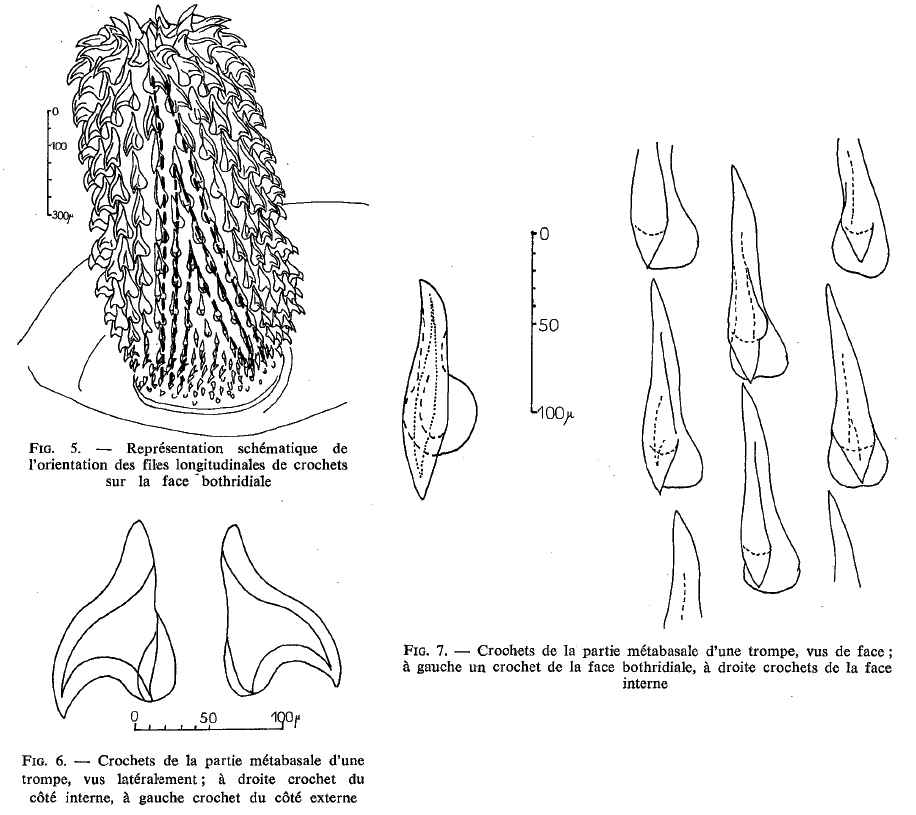 FIG. 5. - Representation schematique de l'orientation des mes longitudinales de crochets sur la face - bothridiale. FIG. 6. - Crochets de la partie metabasale d'une trompe, vus lateraJ.ement ; a droite crochet du cote interne, a gauche crochet du cote externe. FIG. 7. - Crochets de la partie metabasale d'une trompe, vus de face; a gauche un crochet de la face bothridiale, a droite crochets de la face interne.