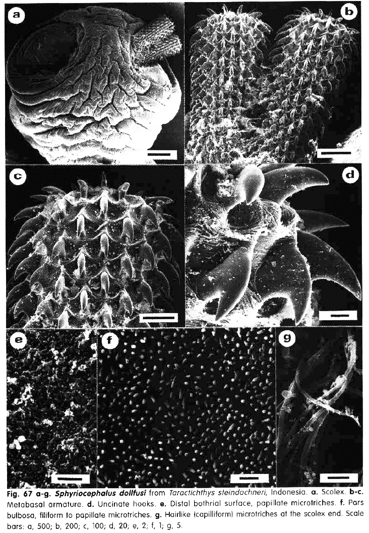 Fig. 67 a-g. Sphyriocephalus dollfusi from Taractichthys steindachneri, Indonesia, a. Scolex. b-c. Metabasal armature, d. Uncinate hooks, e. Distal bothrial surface, papillate microtriches. f. Pars bulbosa, filiform to papillate microtriches. g. Hairlike (capilliform) microtriches at the scolex end. Scale