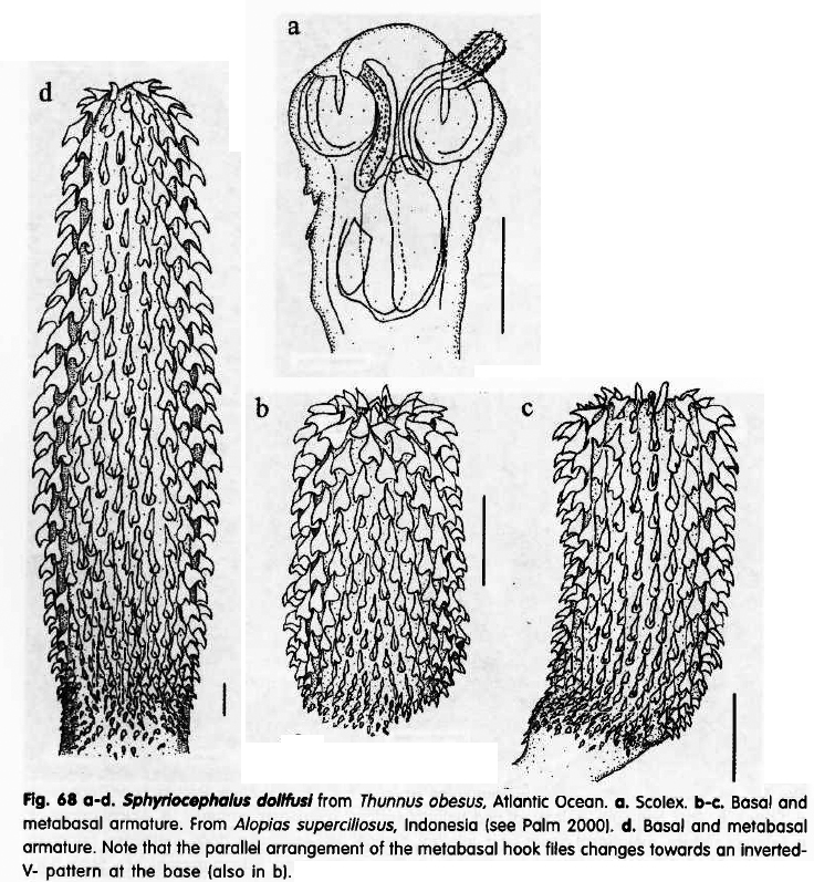 Fig. 68 a-d. Sphyriocephalus dollfusi from Thunnus obesus, Atlantic Ocean, a. Scolex. b-c. Basal and