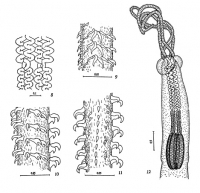 FIG. 8. T. pseudodera. Section of scolex showing "brackets." FIG 9. T. pseudodera. Proboscis, lateral side. FIG. 10. T. pseudodera. Proboscis, inner side. FIG 11. T. pseudodera. Proboscis, outer side. FIG 12. T. pseudodera. Scolex, ventral view. cs--cirrus sac. t--testis. vs--vas deferens. vt--vitelline glands.