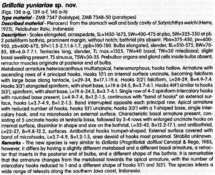 ... MoreFig. 138 a-g. Grillotia yuniariae sp. nov. from Satyrichthys weichi, Indonesia, a. Scolex. b. Internal