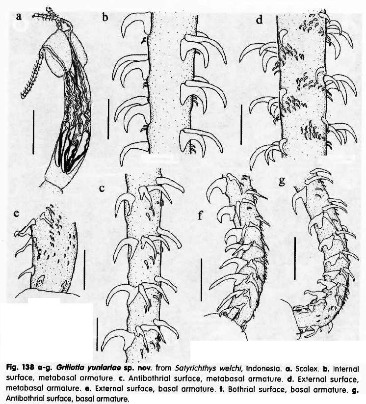 surface, apical armature, c. Antibothrial surface, metobosol armature, d. External surface,... MoreFig. 139 a-f. Grillotia yuniariae sp. nov. from Satyrichthys welchi, Indonesia, a. Scolex. b. Antibotliriol