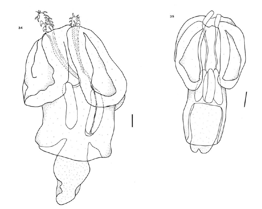 Fig. 34 Heteronybelinia minima sp. nov.. Scolex from Harpodon nehereus. Scale bar=50µm. Fig. 35 H. minima sp. nov.. Scolex from Polynemus paradiseus. Scale bar=100µm.