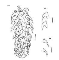Fig. 36 H. minima sp. nov. from P. paradiseus. Heteromorphous metabasal armature, bothridial (left hand side) and antibothridial (right hand side) surfaces. Scale bar=15µm. Fig. 37 H. minima sp, nov., hooks on bothridial surface. Scale bar=15µm. Fig. 38. H. minima sp. nov., hooks on antibothridial surface. Scale bar=15 µm.