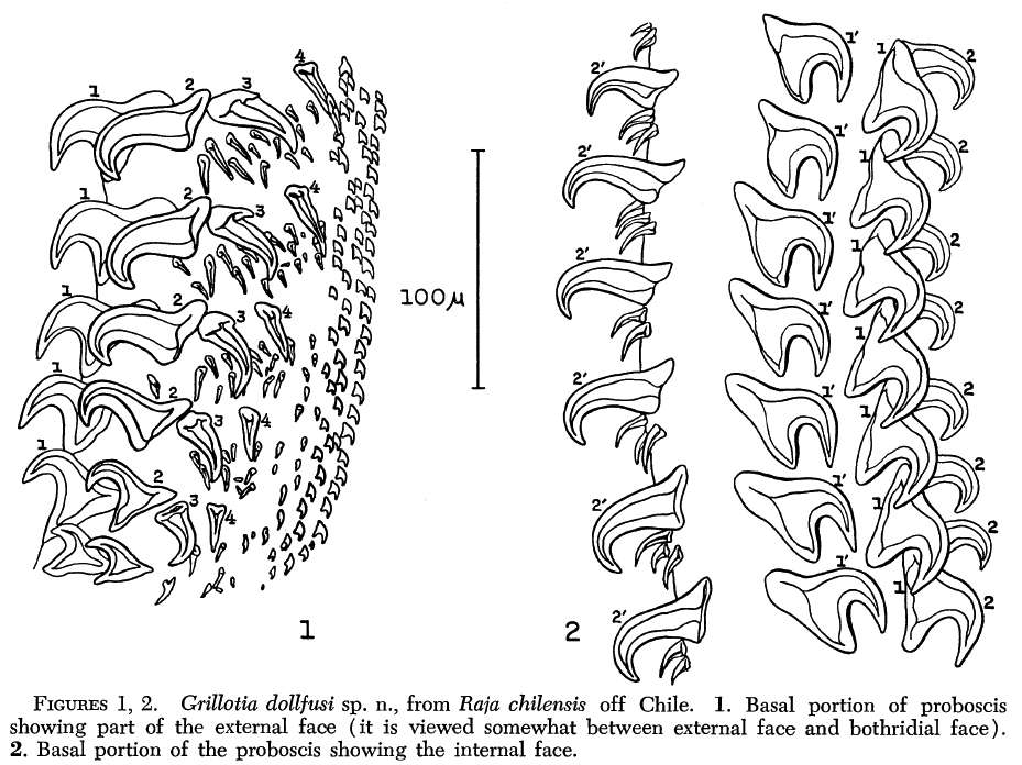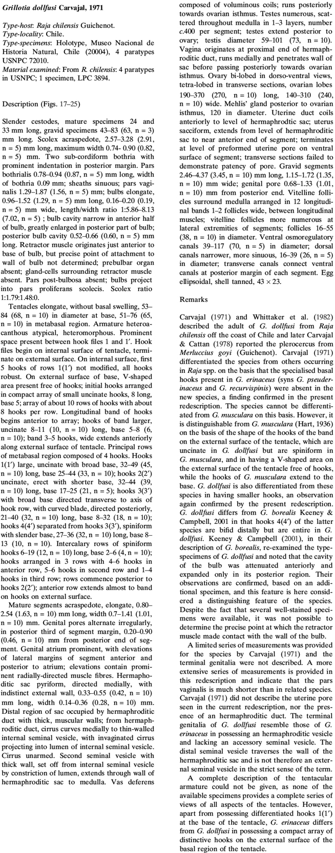 Carvajal, J.. 1971. Grillotia dollfusi sp. n. (Cestoda: Trypanorhyncha) from the skate Raja chilensis, from Chile, and a note on G. heptanchi. Journal of Parasitology 57: 1269-1271.