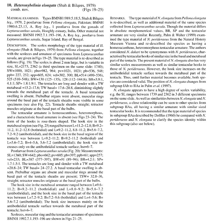 Shah, M. and F. M. Bilqees. 1979. Nybelinia elongata, new species from the fish Pellona elongata of Karachi coast. Pakistan Journal of Zoology 11: 231-233. (4374) Download PDFPalm, H. W. 1999. Nybelinia Poche, 1926, Heteronybelinia gen. nov. and Myxonebelinia gen. nov. (Cestoda: Trypanorhyncha) in the collections of The Natural History Museum, London. Bulletin of the Natural History Museum, London (Zoology series) 65(2): 133-153. (4368) Download PDF |