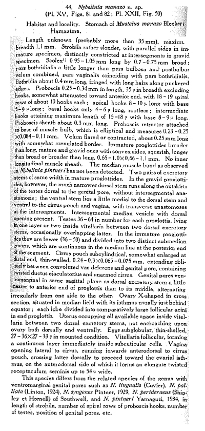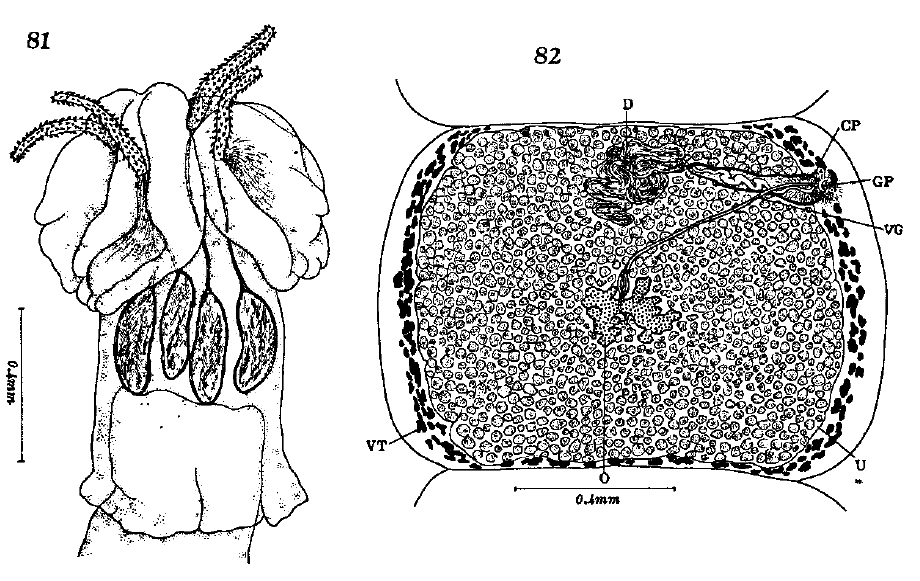 Pl. XV. Fig. 81. Scolex of Nybelinia manazo, ventral view. Fig. 82. Gravid proglottis of Nybelinia manazo, dorsal view.