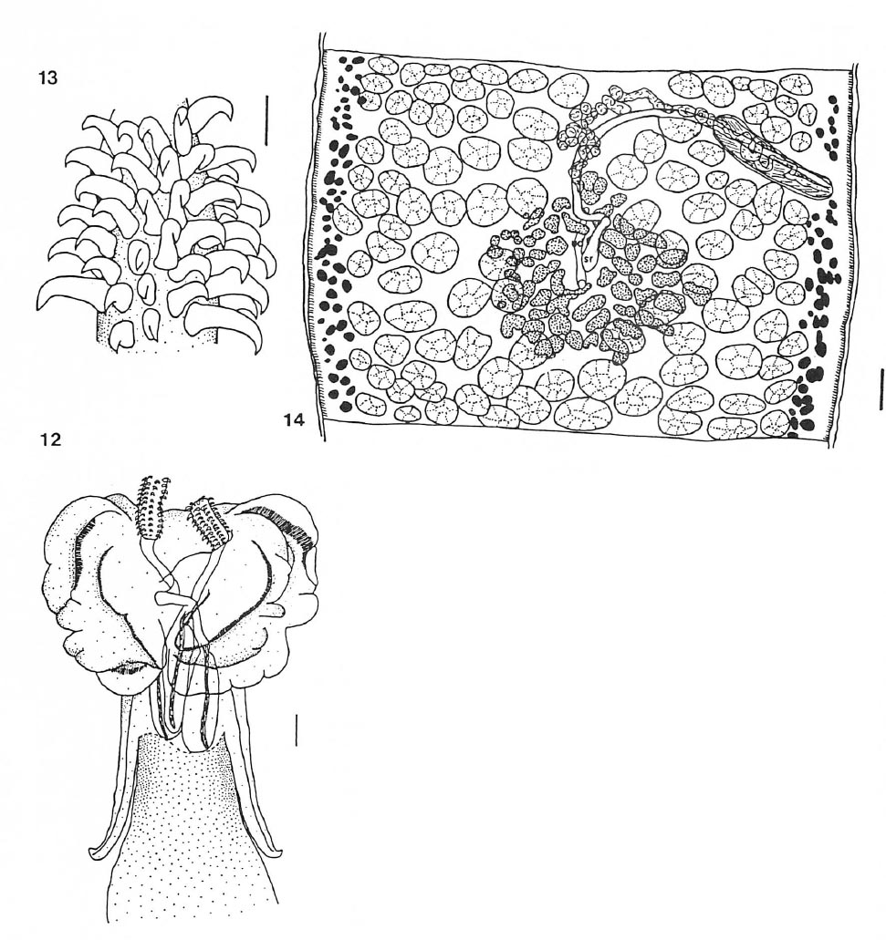 receptacle (sr). Scale bars: Figure 12, 50 µm; Figure 13, 10 µm; Figure 14, 50 µm