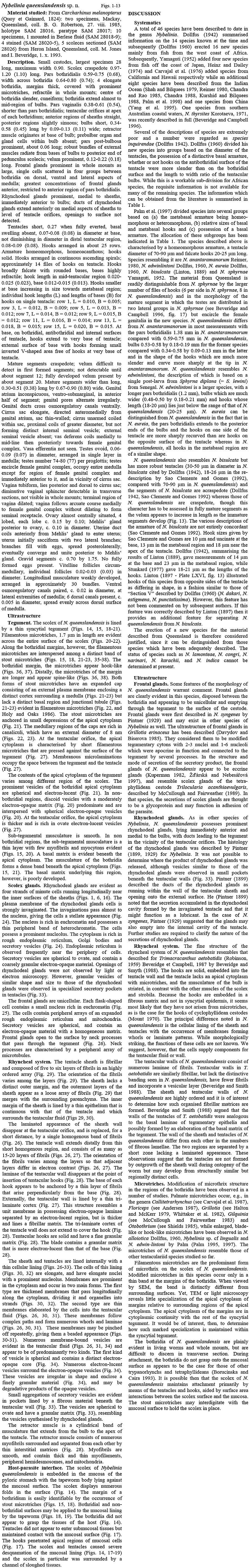 Jones, M. K. and I. Beveridge. 1998. Nybelinia queenslandensis sp. n. (Cestoda: Trypanorhyncha) parasitic in Carcharhinus melanopterus, from Australia, with observations on the fine structure of the scolex including the rhyncheal system. Folia Parasitologica 45: 295-311. (560) Download PDF |