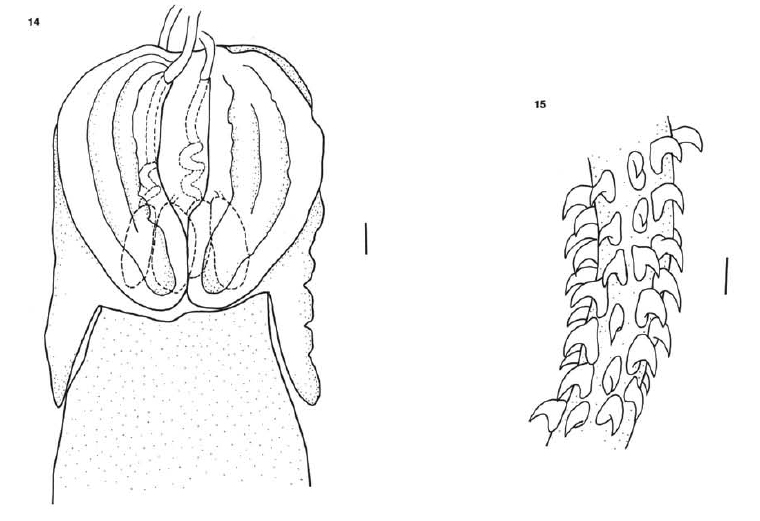 Fig. 14 Nybelinia schmidti sp. nov. Scolex from Isurus glaucus. Scale bar=100µm. Fig. 15 N. schmidti sp. nov. Homeomorphus basal and metabasal armature. Scale bar=10µm.