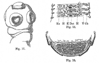 Fig. 17. Davainea galeritae n. sp. Scolex. Fig. 18. Davainea galeritae n. sp. Flächenschnitt durch 3 Proglottiden. Cb Cirrusbeutel; V Vagina; H Hoden; Dst Dotterstock; K Keimstock; Ex ventrales Exkretionsgefäß. Fig. 19. Davainea galeritae n. sp. Flächenschnitt durch eine letzte, reife Proglottis mit Parenchymkapseln.