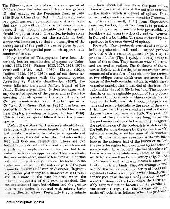 Rees, G. 1944. A new cestode of the genus Grillotia from a shark. Parasitology 35: 180-185. (4386) Download PDF |